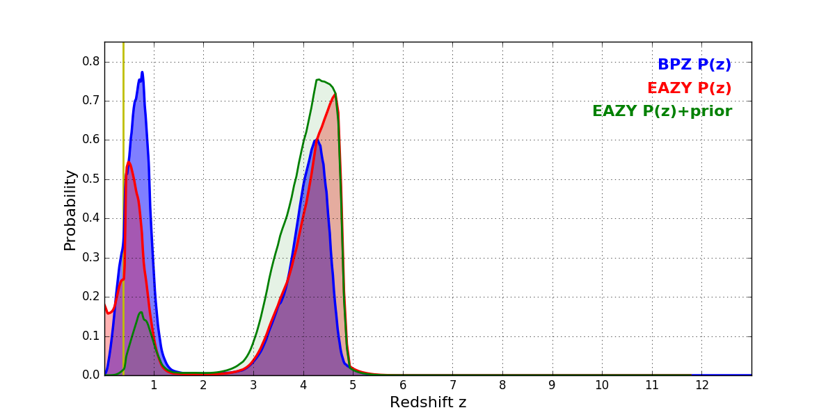 In P(z) plots: Yellow lines mark the cluster redshift z = 0.383,
