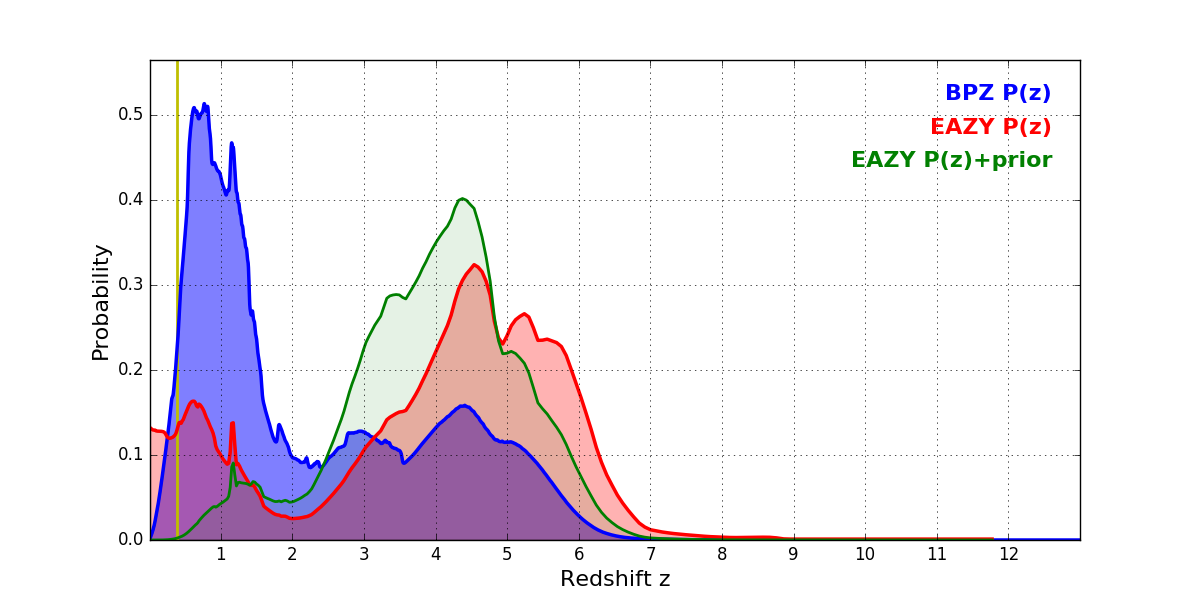 In P(z) plots: Yellow lines mark the cluster redshift z = 0.383,