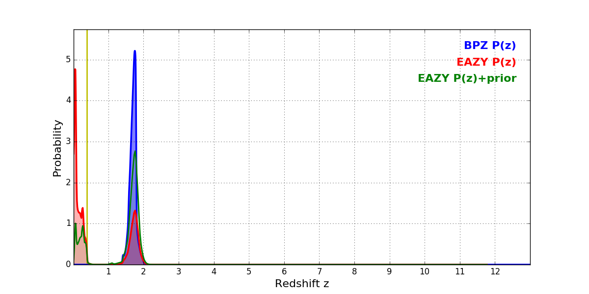 In P(z) plots: Yellow lines mark the cluster redshift z = 0.383,