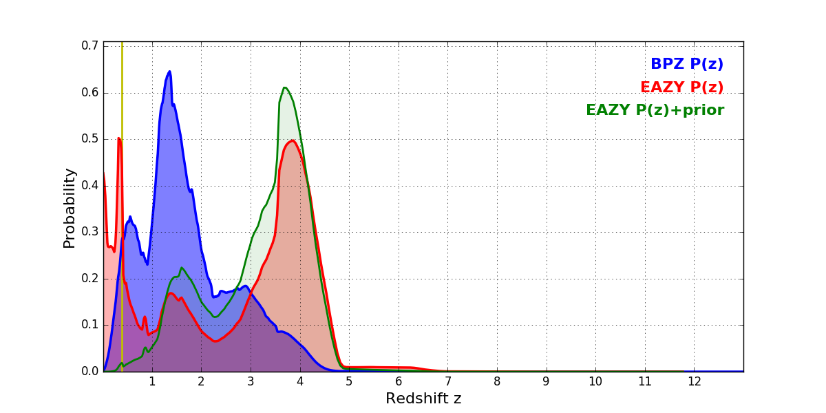 In P(z) plots: Yellow lines mark the cluster redshift z = 0.383,