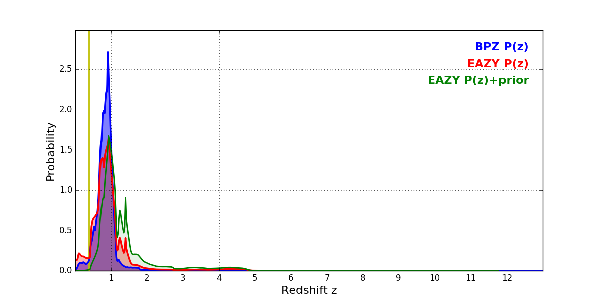 In P(z) plots: Yellow lines mark the cluster redshift z = 0.383,
