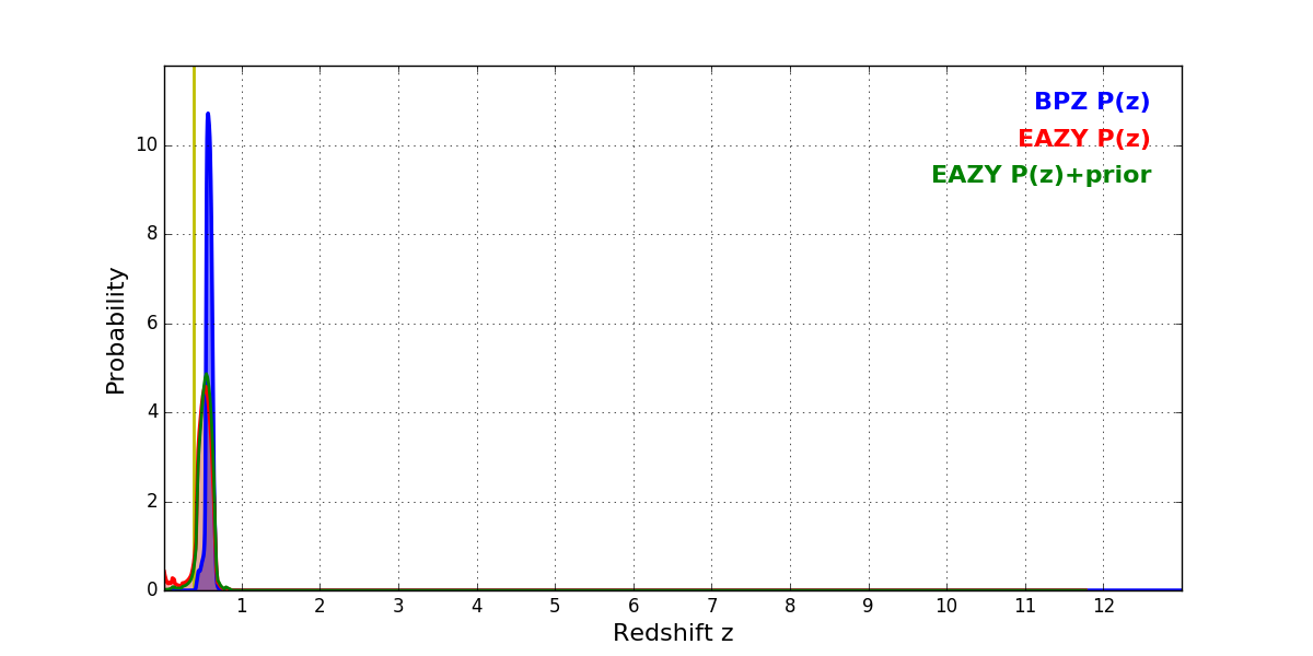 In P(z) plots: Yellow lines mark the cluster redshift z = 0.383,