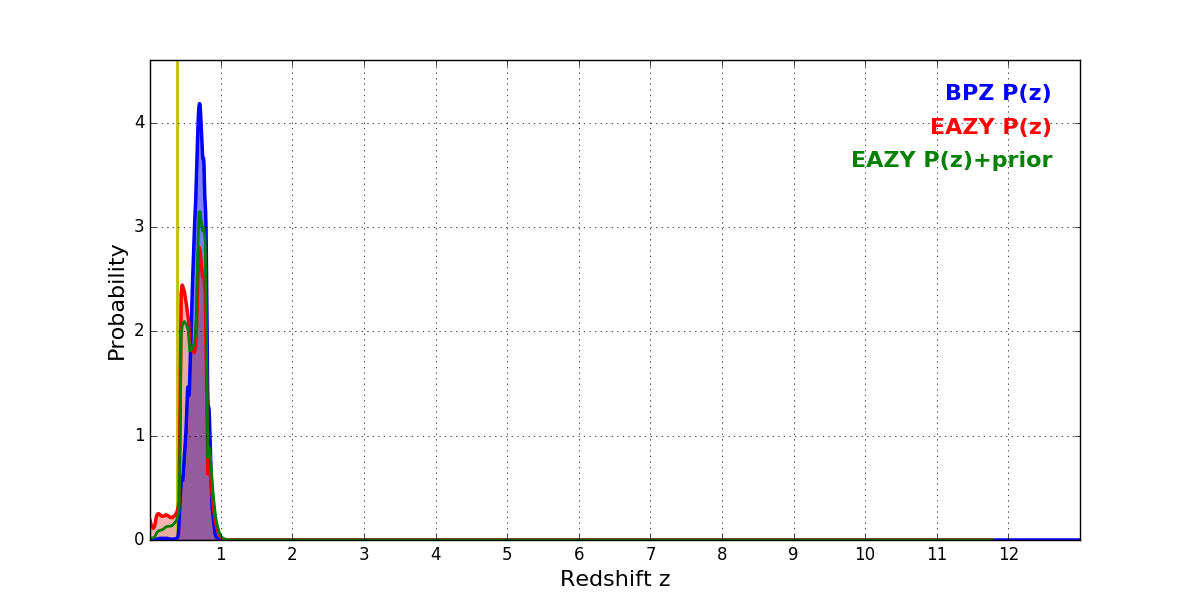 In P(z) plots: Yellow lines mark the cluster redshift z = 0.383,