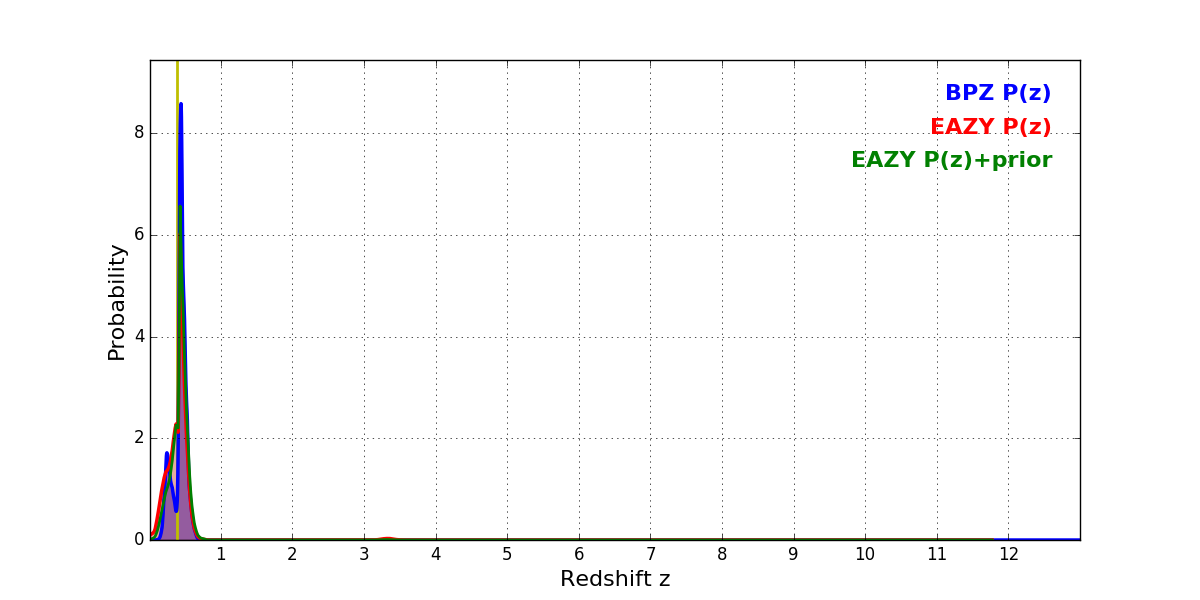 In P(z) plots: Yellow lines mark the cluster redshift z = 0.383,