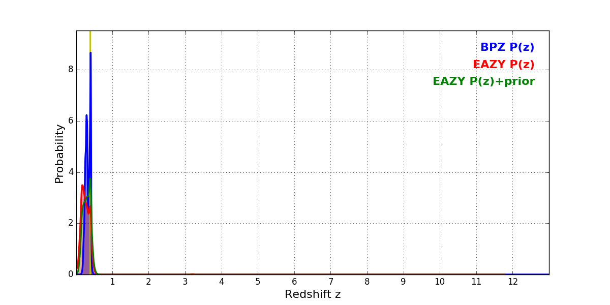 In P(z) plots: Yellow lines mark the cluster redshift z = 0.383,