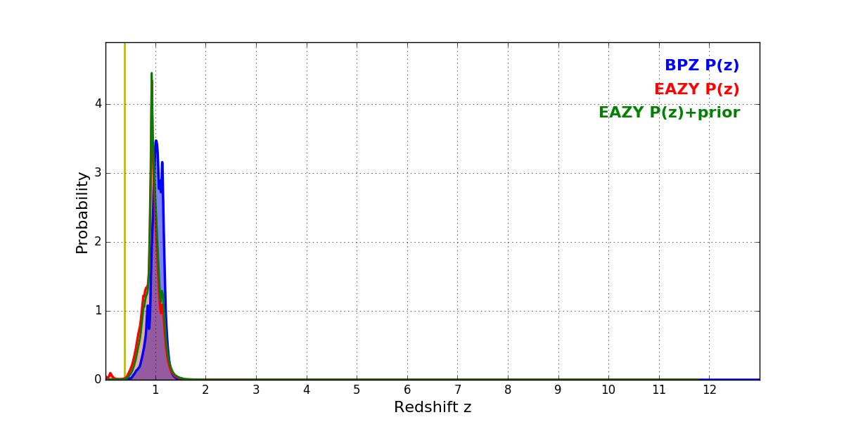In P(z) plots: Yellow lines mark the cluster redshift z = 0.383,