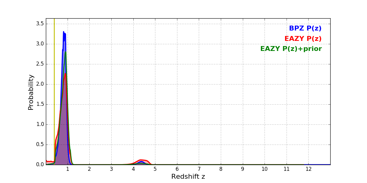 In P(z) plots: Yellow lines mark the cluster redshift z = 0.383,
