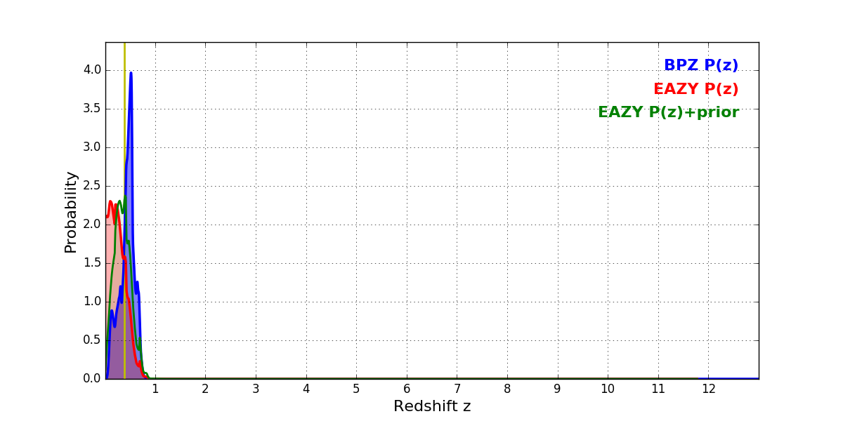 In P(z) plots: Yellow lines mark the cluster redshift z = 0.383,