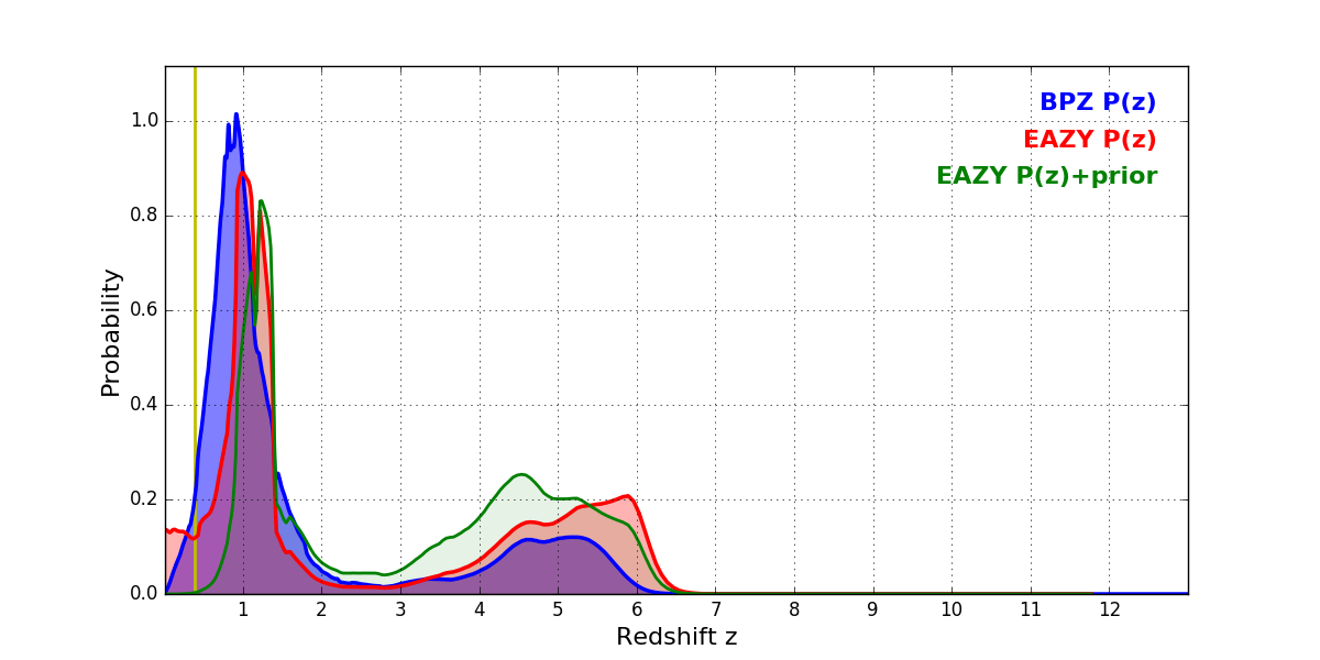 In P(z) plots: Yellow lines mark the cluster redshift z = 0.383,