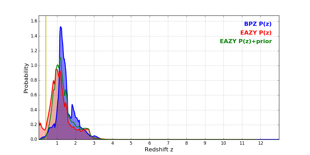 In P(z) plots: Yellow lines mark the cluster redshift z = 0.383,