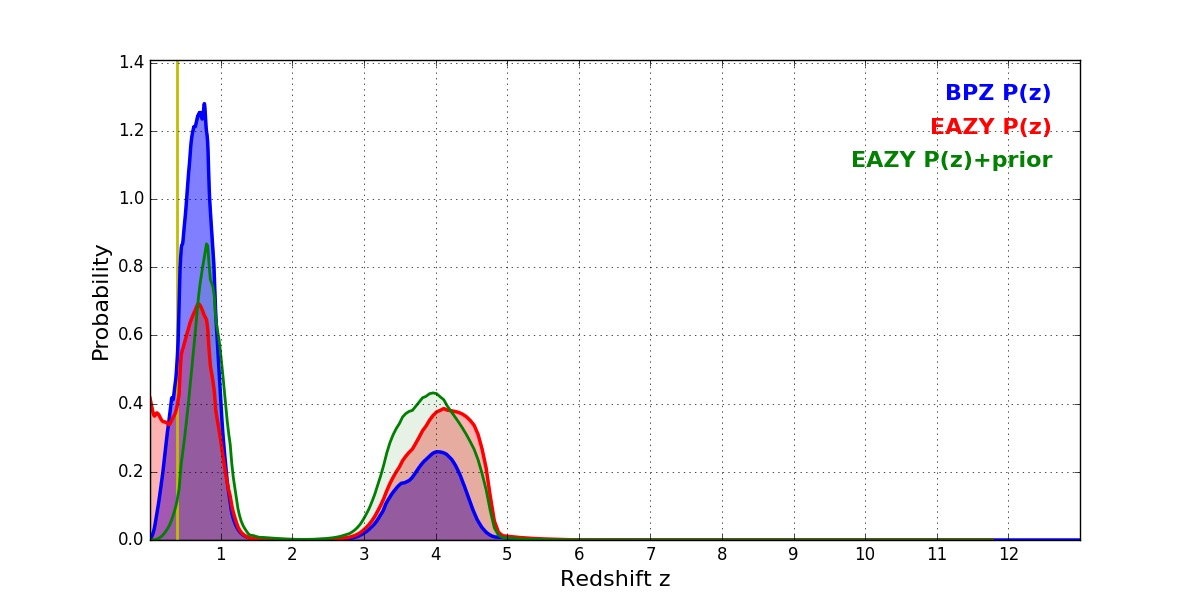 In P(z) plots: Yellow lines mark the cluster redshift z = 0.383,
