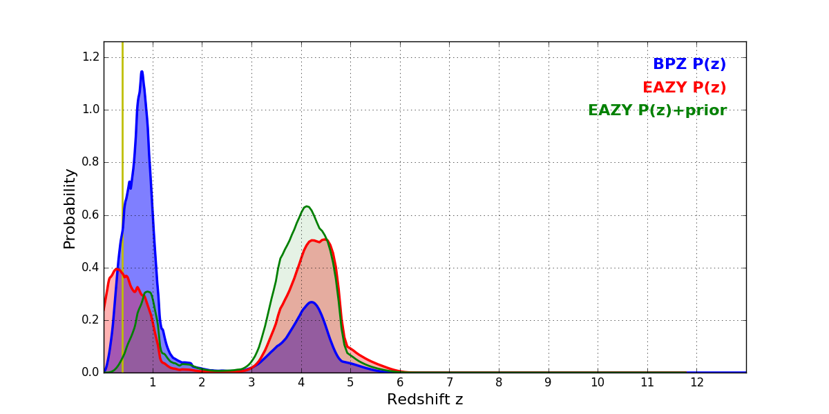 In P(z) plots: Yellow lines mark the cluster redshift z = 0.383,