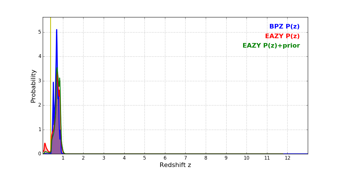 In P(z) plots: Yellow lines mark the cluster redshift z = 0.383,