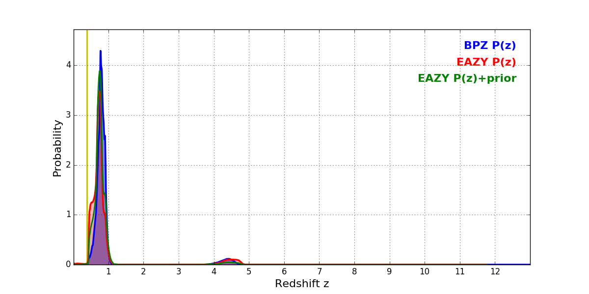 In P(z) plots: Yellow lines mark the cluster redshift z = 0.383,