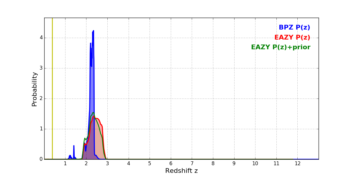 In P(z) plots: Yellow lines mark the cluster redshift z = 0.383,