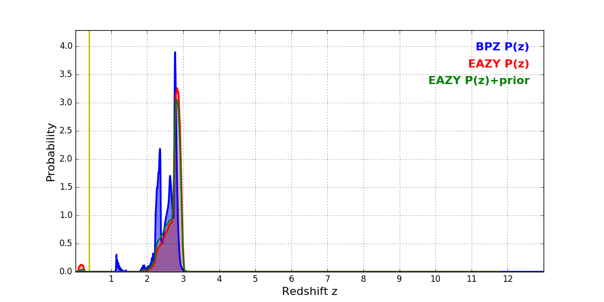 In P(z) plots: Yellow lines mark the cluster redshift z = 0.383,