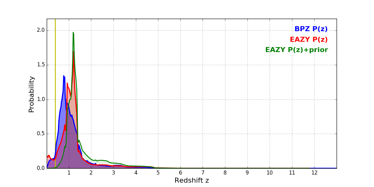In P(z) plots: Yellow lines mark the cluster redshift z = 0.383,