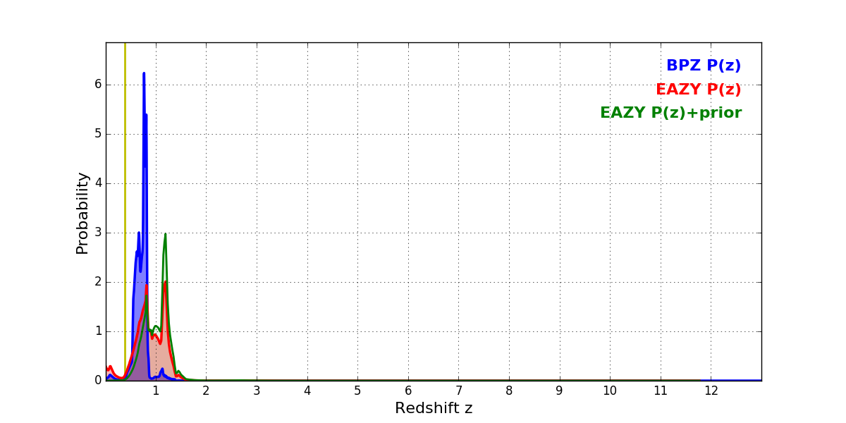 In P(z) plots: Yellow lines mark the cluster redshift z = 0.383,