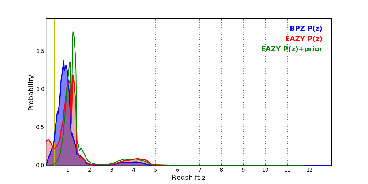In P(z) plots: Yellow lines mark the cluster redshift z = 0.383,