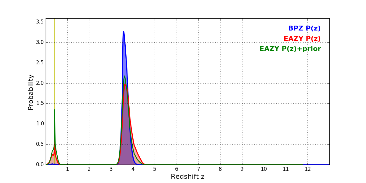In P(z) plots: Yellow lines mark the cluster redshift z = 0.383,
