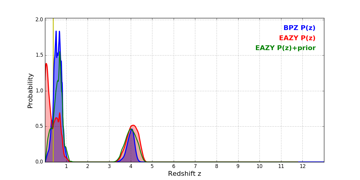 In P(z) plots: Yellow lines mark the cluster redshift z = 0.383,