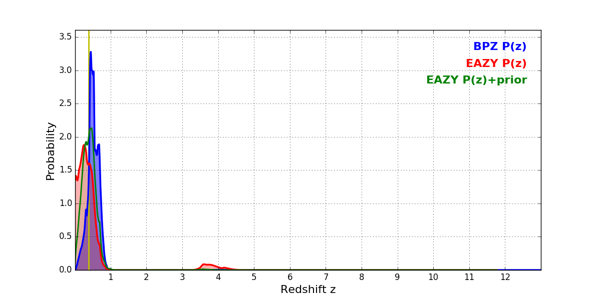 In P(z) plots: Yellow lines mark the cluster redshift z = 0.383,