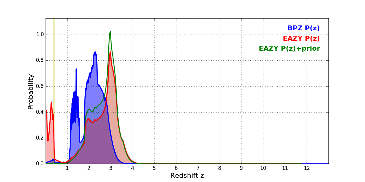 In P(z) plots: Yellow lines mark the cluster redshift z = 0.383,