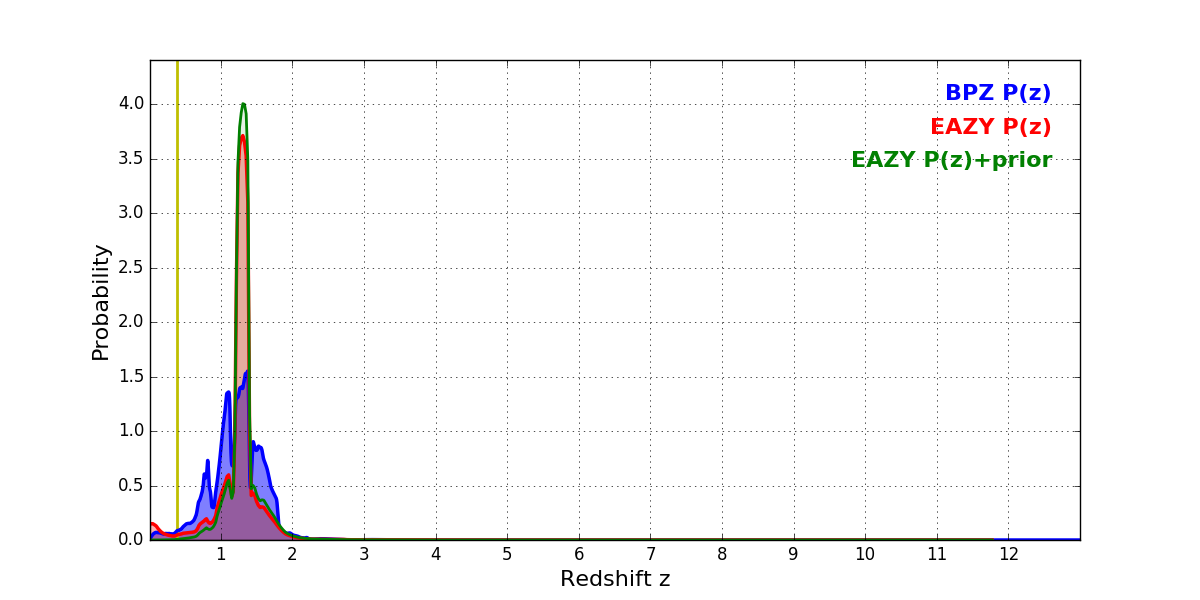 In P(z) plots: Yellow lines mark the cluster redshift z = 0.383,