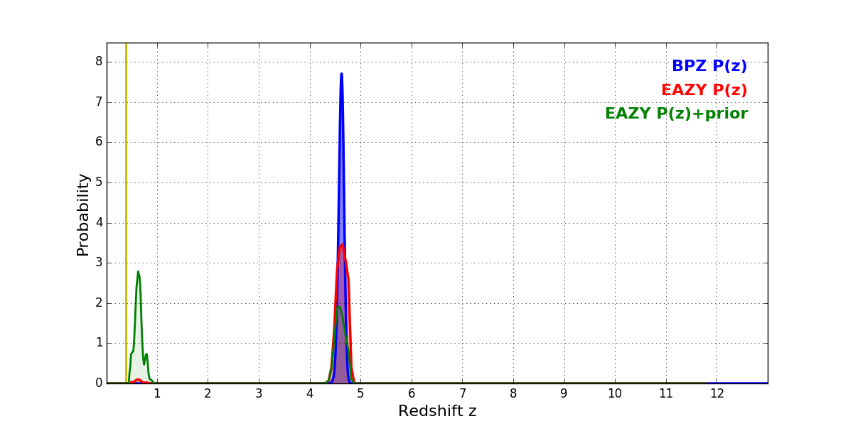 In P(z) plots: Yellow lines mark the cluster redshift z = 0.383,