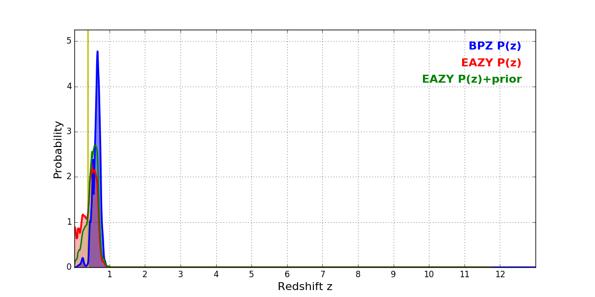 In P(z) plots: Yellow lines mark the cluster redshift z = 0.383,