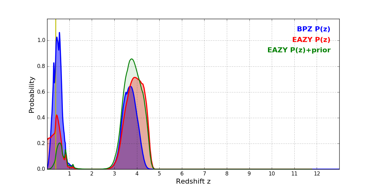 In P(z) plots: Yellow lines mark the cluster redshift z = 0.383,