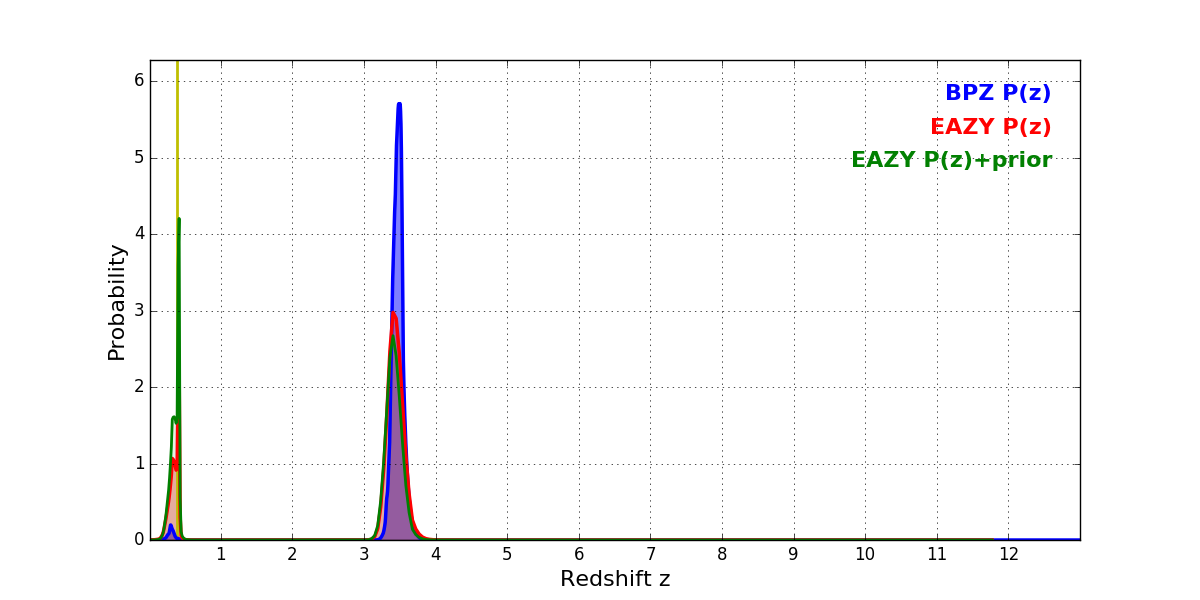 In P(z) plots: Yellow lines mark the cluster redshift z = 0.383,