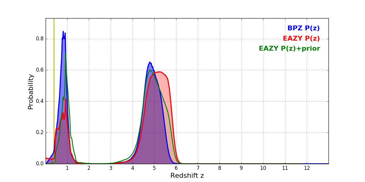 In P(z) plots: Yellow lines mark the cluster redshift z = 0.383,