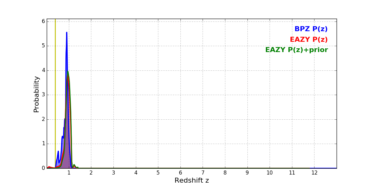 In P(z) plots: Yellow lines mark the cluster redshift z = 0.383,