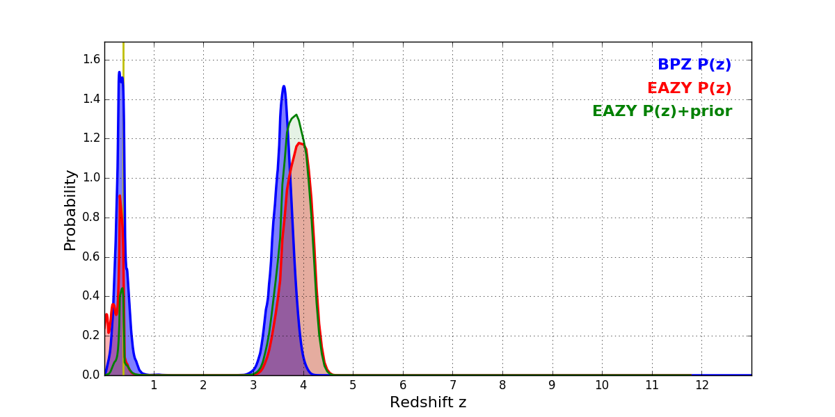 In P(z) plots: Yellow lines mark the cluster redshift z = 0.383,