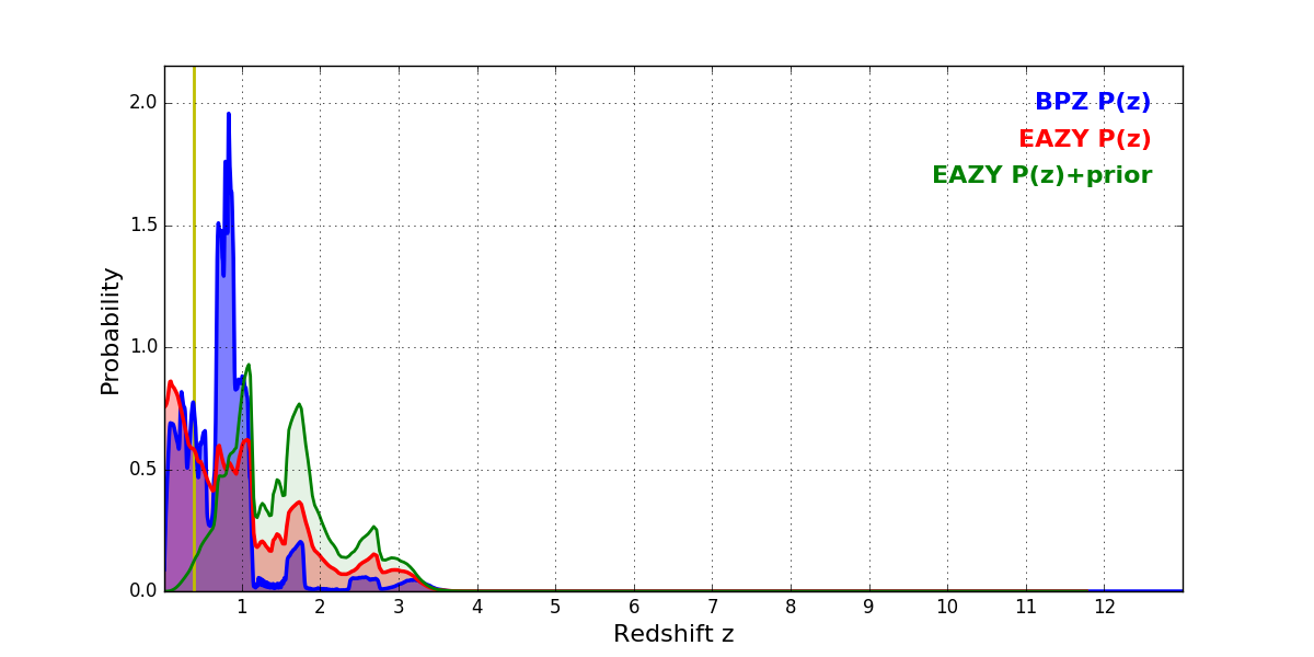 In P(z) plots: Yellow lines mark the cluster redshift z = 0.383,
