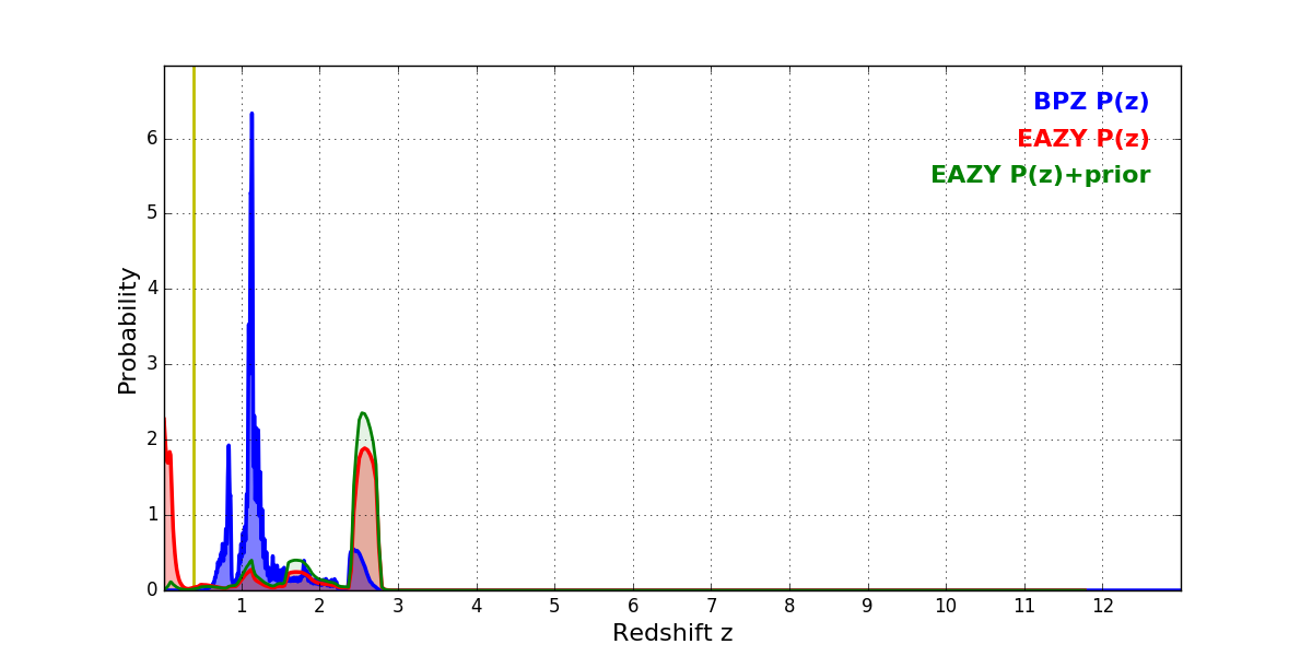 In P(z) plots: Yellow lines mark the cluster redshift z = 0.383,