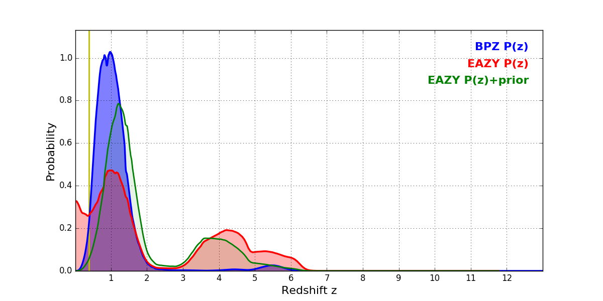 In P(z) plots: Yellow lines mark the cluster redshift z = 0.383,