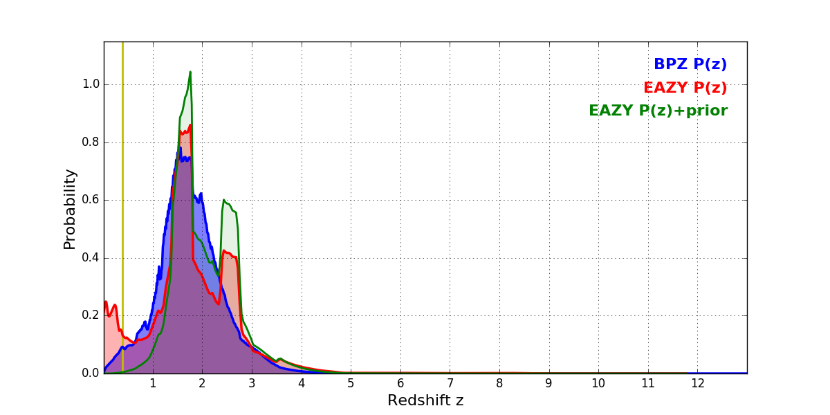 In P(z) plots: Yellow lines mark the cluster redshift z = 0.383,