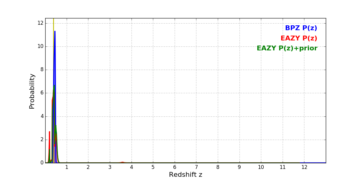 In P(z) plots: Yellow lines mark the cluster redshift z = 0.383,