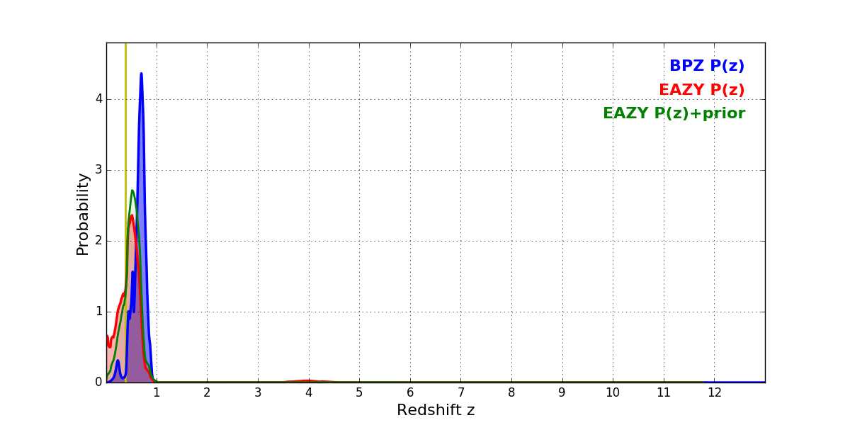 In P(z) plots: Yellow lines mark the cluster redshift z = 0.383,