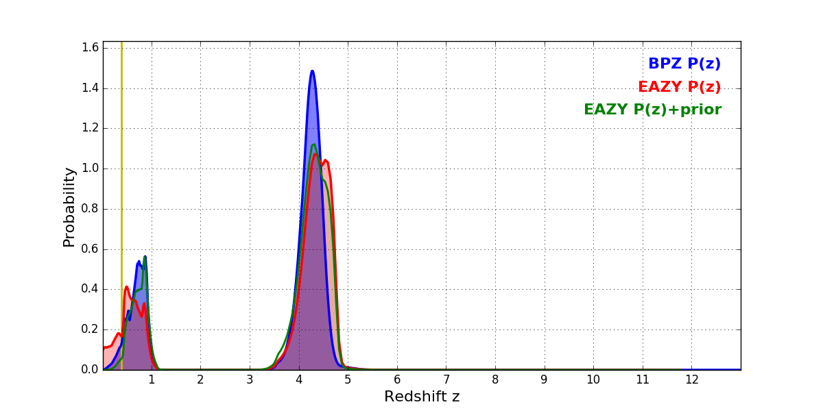 In P(z) plots: Yellow lines mark the cluster redshift z = 0.383,