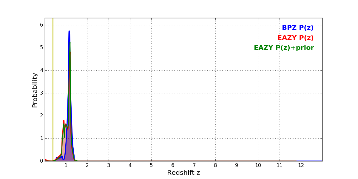 In P(z) plots: Yellow lines mark the cluster redshift z = 0.383,