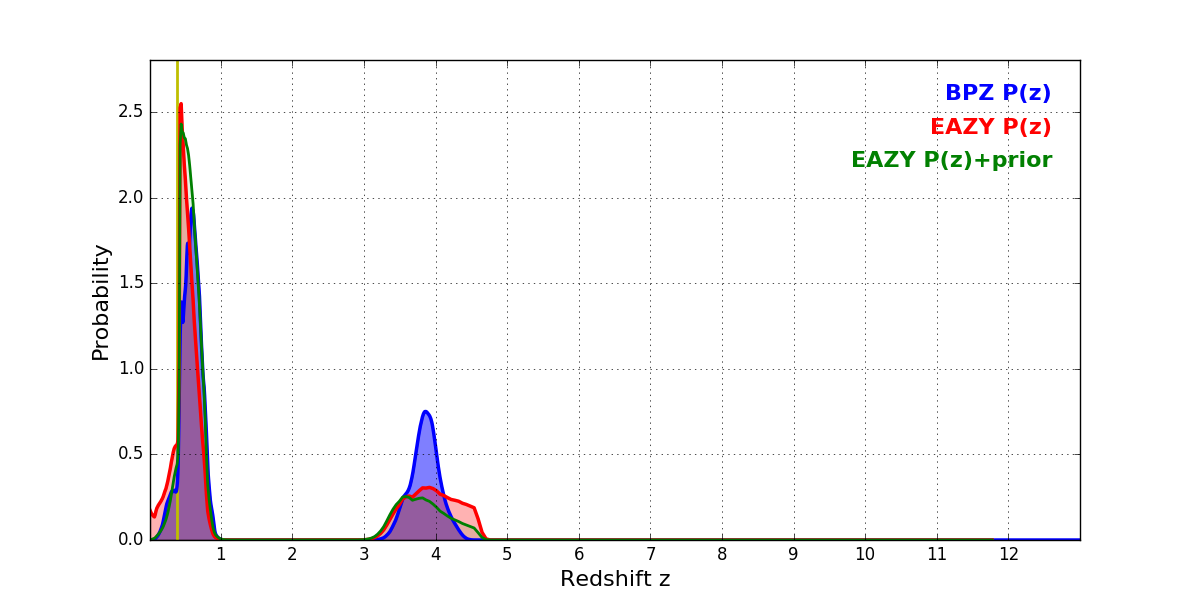 In P(z) plots: Yellow lines mark the cluster redshift z = 0.383,