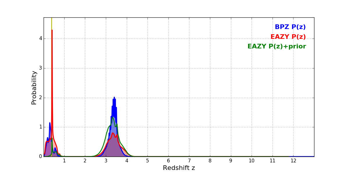 In P(z) plots: Yellow lines mark the cluster redshift z = 0.383,