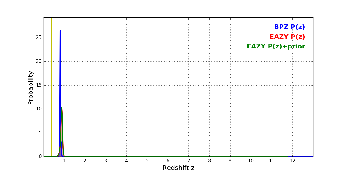 In P(z) plots: Yellow lines mark the cluster redshift z = 0.383,