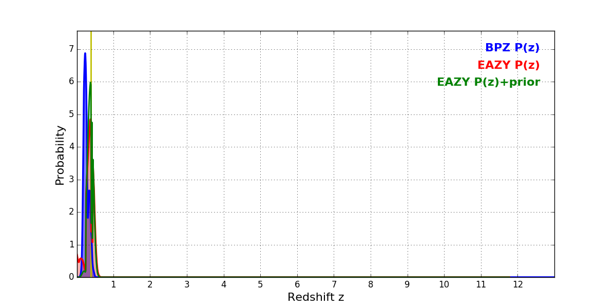 In P(z) plots: Yellow lines mark the cluster redshift z = 0.383,