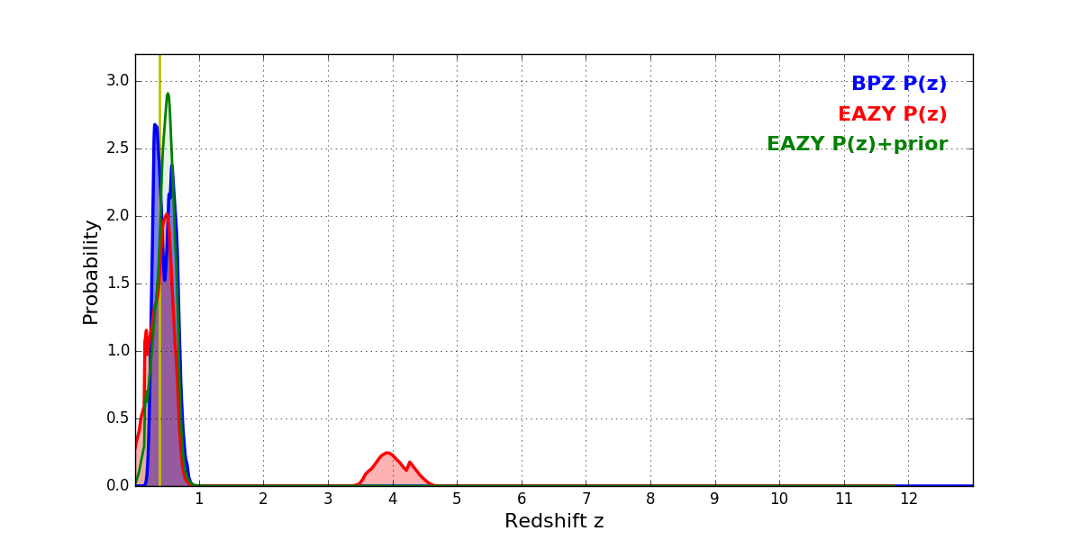 In P(z) plots: Yellow lines mark the cluster redshift z = 0.383,