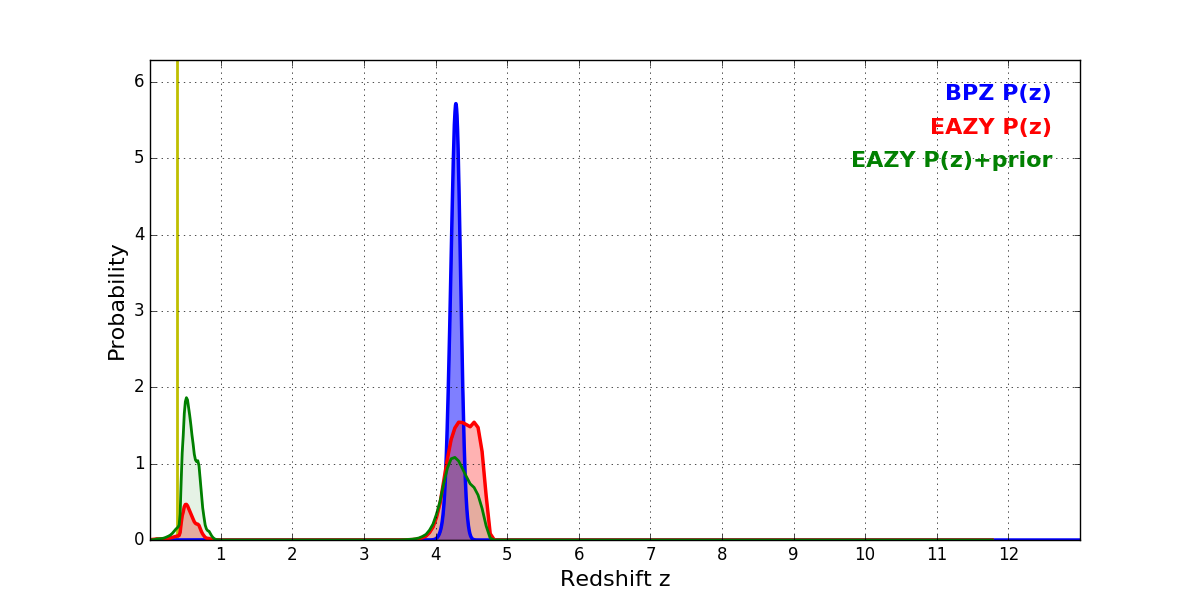 In P(z) plots: Yellow lines mark the cluster redshift z = 0.383,