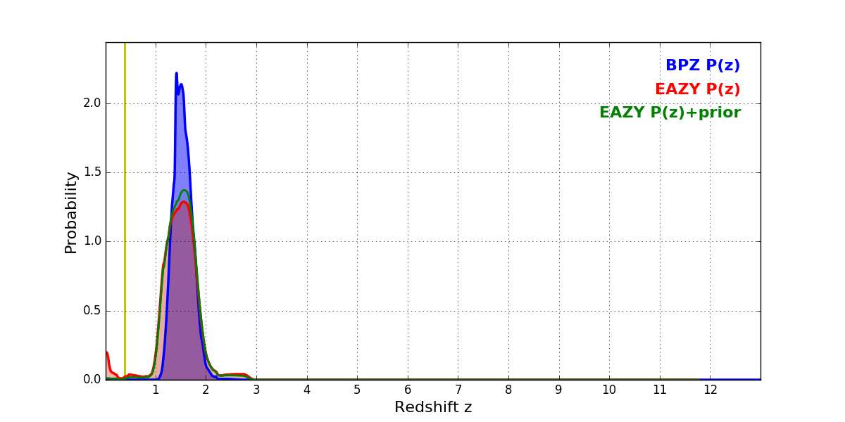 In P(z) plots: Yellow lines mark the cluster redshift z = 0.383,